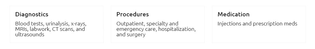 - Medications and therapies: Rx, rehab, acupuncture; some require add-ons.